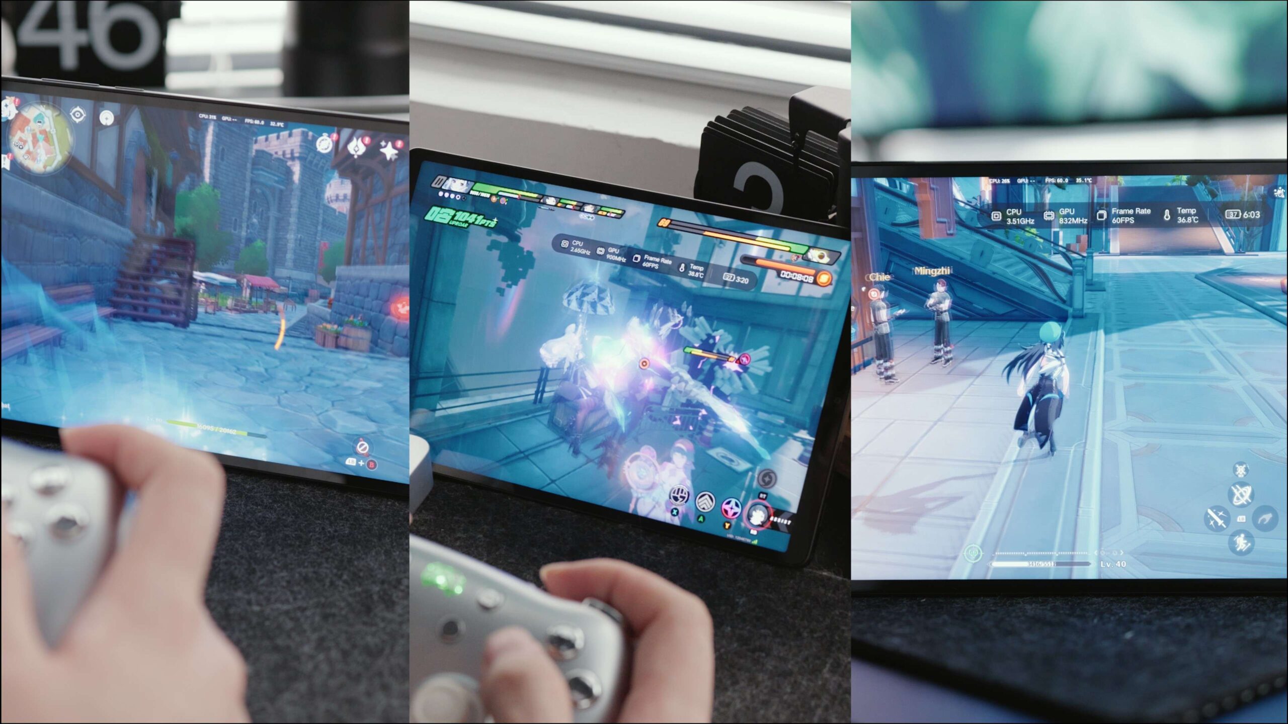 در مرحله بعد، بازی دشوارتر Wuthering Waves را امتحان کردیم. از همان ابتدا، دستگاه با مصرف برق ۱۶ وات کار میکرد که تقریباً نزدیک به مصرف برقی است که در آزمایش ۳DMark دیدیم. اما بعد از حدود ۶ دقیقه، کمی شروع به کند شدن کرد. گاهی اوقات، نرخ فریم به ۶۰ فریم در ثانیه برمیگشت. اما به محض اینکه دوباره به یک صحنه پیچیده برخورد میکردیم، نرخ فریم همچنان کاهش مییافت. دما به ۴۸ درجه رسید، اما عمدتاً در مرکز پشت بود، بنابراین خیلی ناراحتکننده نبود.