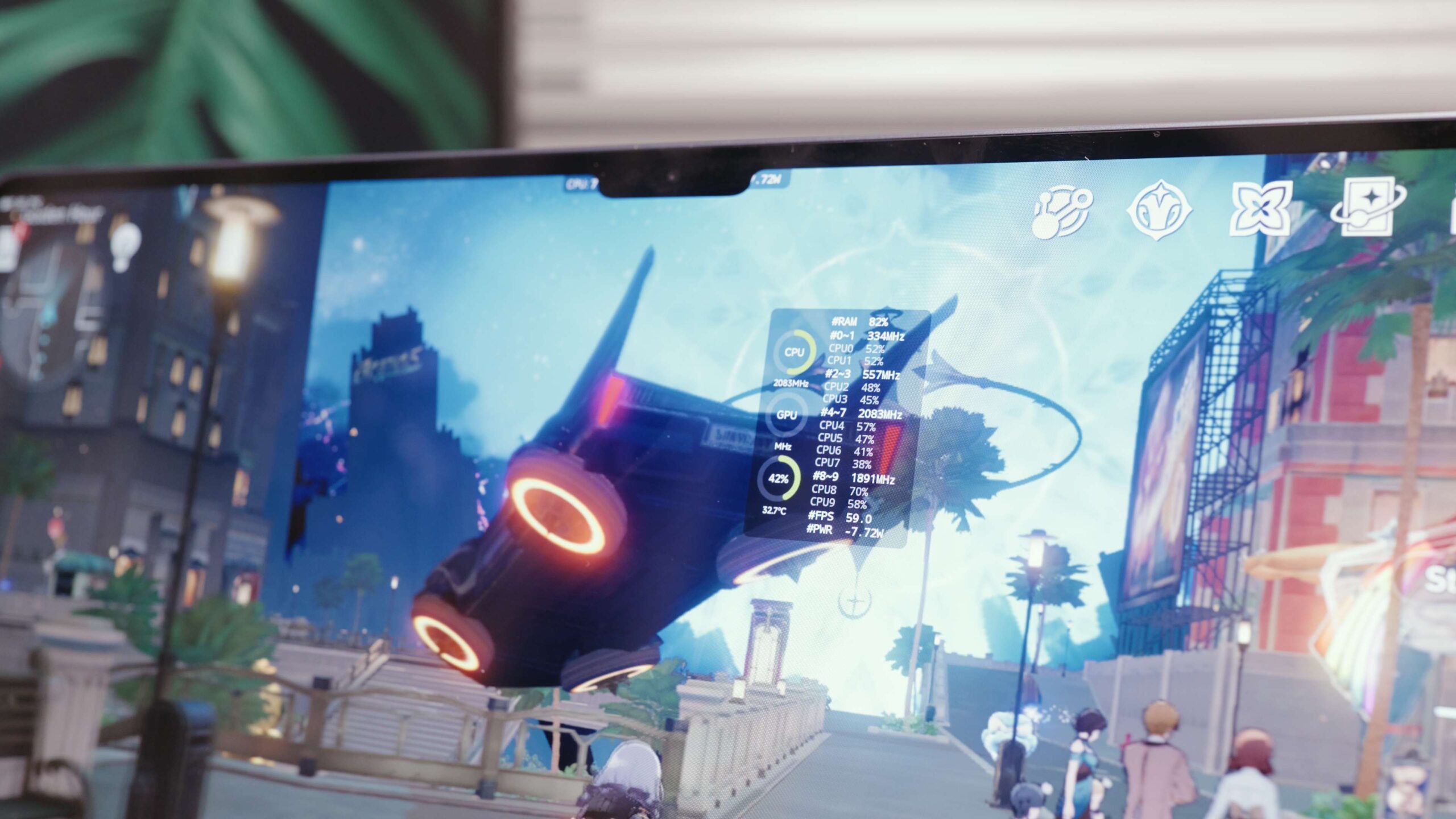 حالا بیایید چند تست بازی انجام دهیم. اولین مورد Hongkai: Star Rail است که در ساعت طلایی اجرا میشود. وقتی آن را در دمای اتاق ۲۵ درجه سانتیگراد و با حالت عملکرد روشن اجرا کردیم، نرخ فریم تقریباً بینقص بود. اما در اینجا کمی مصرف باتری داشت و در یک آزمایش ۱۵ دقیقهای ۱۰٪ از باتری را مصرف کرد.